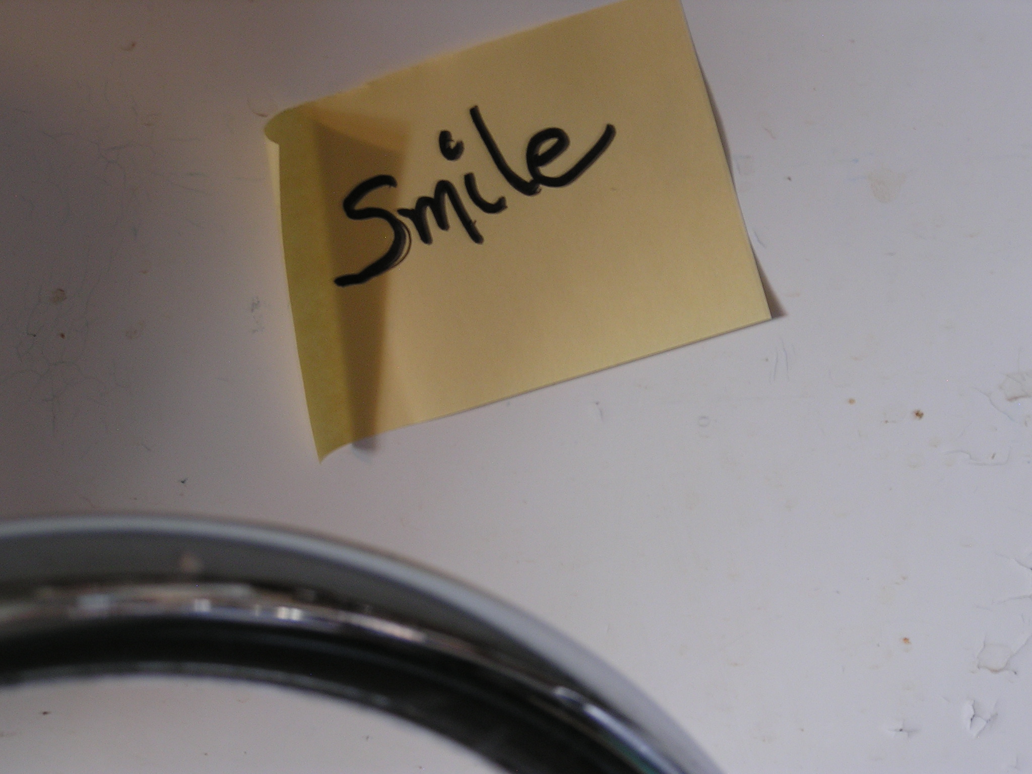 I walk by my kitchen sink and see the reminder note: SMILE. I now automatically smile for a moment. I note that I feel a bit happier. This is completely consistent with lots of psychological studies.